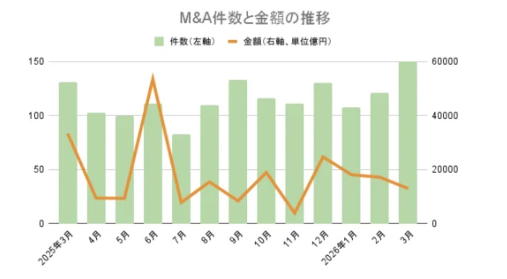 【2026年3月M&A統計】150件(19件増)、2008年の統計開始以来、単月として過去最多を記録
